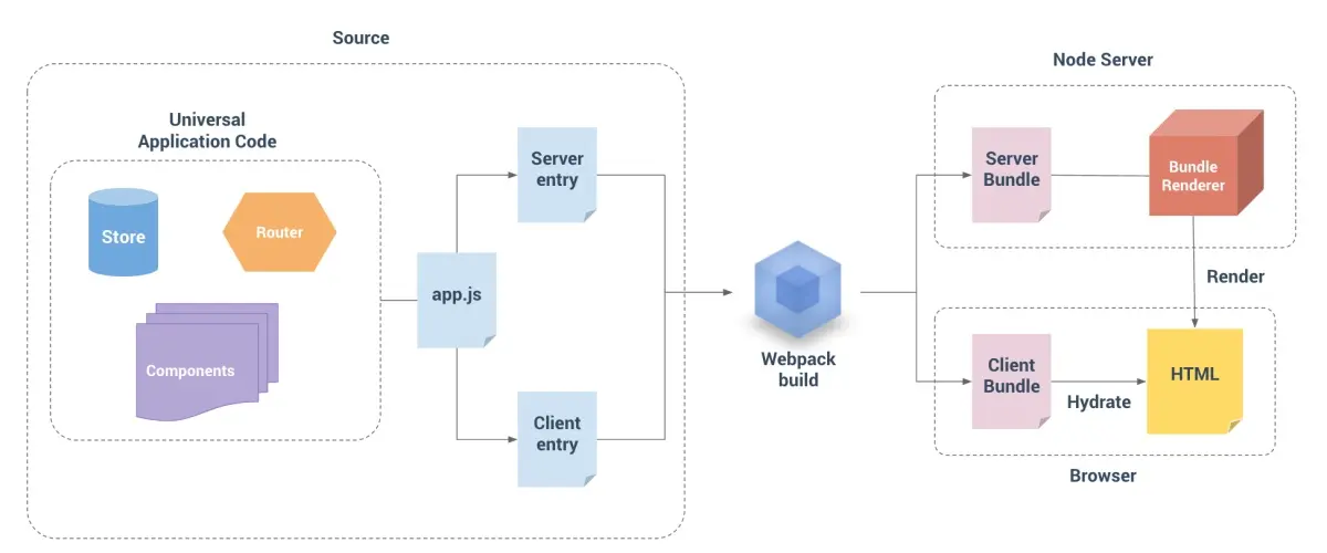 - 在使用 webpack 进行构建时,需要将公共 App 部分打包出来,形成公共代码,由服务器端引入执行,而客户端可以引用打包好的公共代码,再用 webpack 引入之后进行特异处理即可;