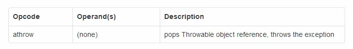 athrow 指令从堆栈中弹出顶部字节,并且会认为它是一个Throwable子类的引用(或Throwable本身)。抛出的异常是弹出对象引用定义的类型。