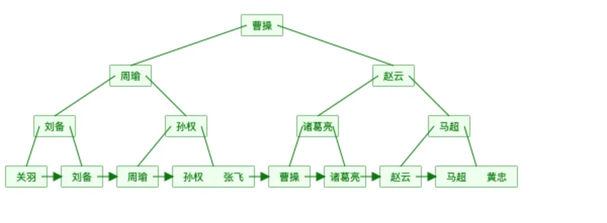 同理,回头看一下B树,我们发现只发送三次磁盘IO就可以找到“张飞”了,这就是B树的优点:一个节点可以存储多个元素,相对于完全平衡二叉树所以整棵树的高度就降低了,磁盘IO效率提高了。而,B+树是B树的升级版,只是把非叶子节点冗余一下,这么做的好处是为了提高范围查找的效率。