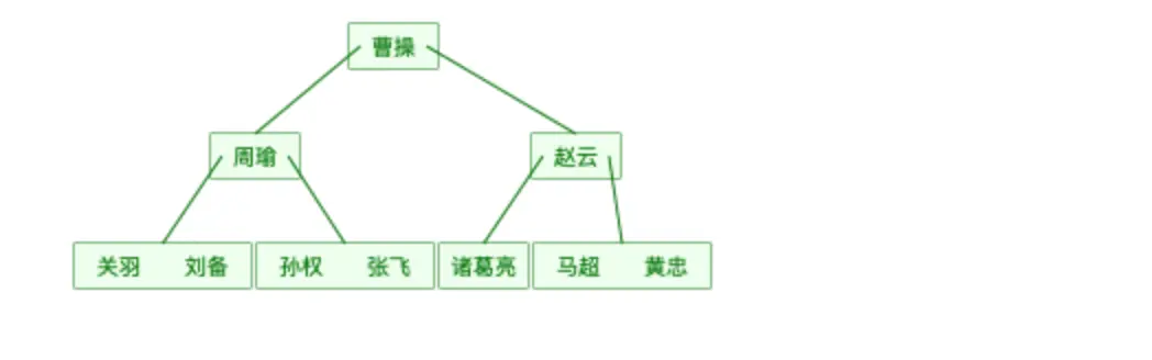 另外需要提醒的是,二叉树是有顺序的,简单的说就是“左边的小于右边的”假如我们现在来查找‘周瑜’,需要找2次(第一次曹操,第二次周瑜),比哈希表要多一次。而且由于完全平衡二叉树是有序的,所以也是支持范围查找的。