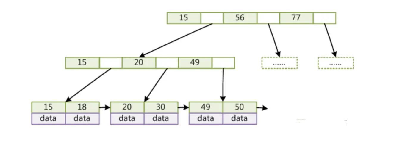 通常我们认为B+树的非叶子节点不存储数据,只有叶子节点才存储数据;而B树的非叶子和叶子节点都会存储数据,会导致非叶子节点存储的索引值会更少,树的高度相对会比B+树高,平均的I/O效率会比较低,所以使用B+树作为索引的数据结构,再加上B+树的叶子节点之间会有指针相连,也方便进行范围查找。上图的data区域两个存储引擎会有不同。