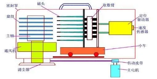 一个磁盘由大小相同且同轴的圆形盘片组成,磁盘可以转动(各个磁盘必须同步转动)。在磁盘的一侧有磁头支架,磁头支架固定了一组磁头,每个磁头负责存取一个磁盘的内容。磁头不能转动,但是可以沿磁盘半径方向运动(实际是斜切向运动),每个磁头同一时刻也必须是同轴的,即从正上方向下看,所有磁头任何时候都是重叠的(不过目前已经有多磁头独立技术,可不受此限制)。