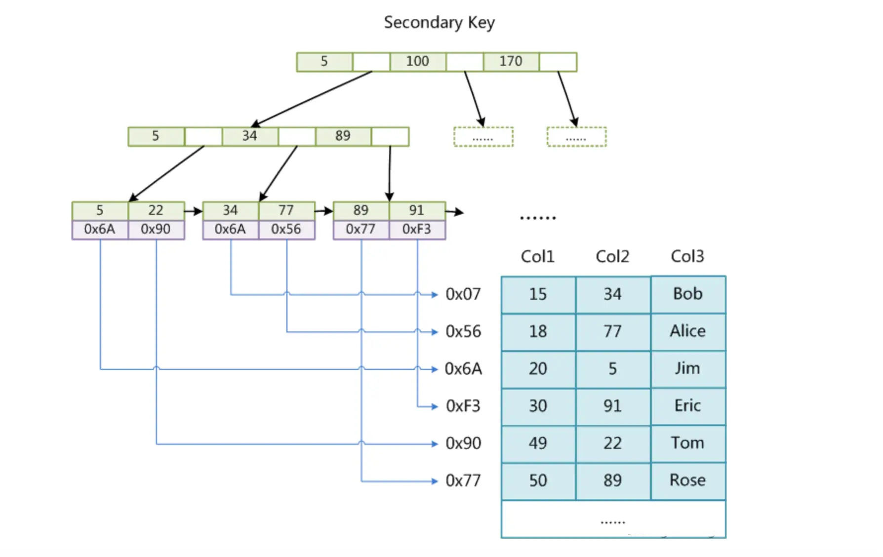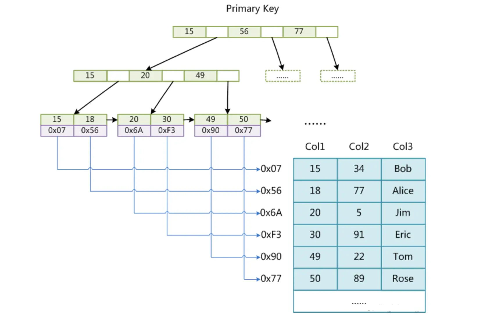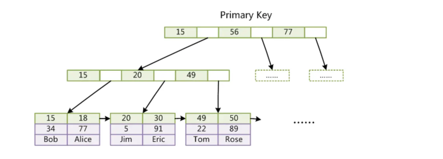 - 非叶子节点:主键+指针