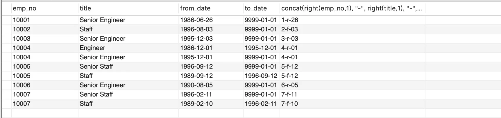 我们模拟数据建立一个联合索引select *, concat(right(emp_no,1), "-", right(title,1), "-", right(from_date,2)) from employees.titles limit 10;