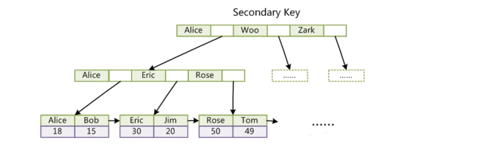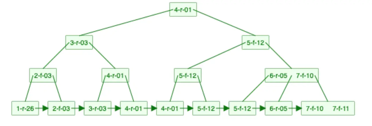 还是上面的表数据用B+树表示如下图(为了简单,数据对应的地址就不画在图中了。):我们可以发现同样的元素,B+树的表示要比B树要“胖”,原因在于B+树中的非叶子节点会冗余一份在叶子节点中,并且叶子节点之间用指针相连。
