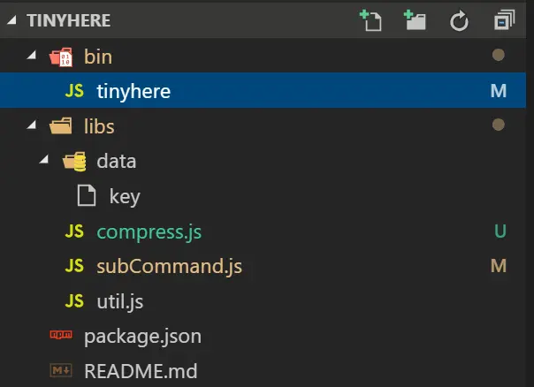 大致上是这样,把全局命令执行的 tinyhere 放在bin目录下,然后subCommand负责提供操作函数,然后把可复用的函数(比如读写操作)抽离出来放在util上,比较复杂的功能单独抽离成一个文件,比如compress,然后导出一个函数给subCommand。至于存放用户的api-key,就存放在data下面的key里。