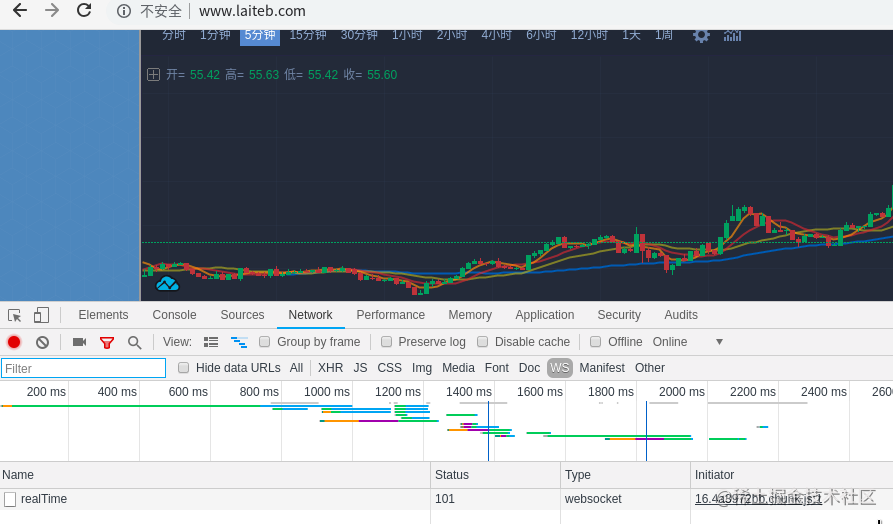 这里以莱特币官网 http://www.laiteb.com/ 实时数据为例。WebSocket 的握手只发生一次,所以如果需要通过浏览器开发者工具观察网络请求,则需要在打开页面的情况下,打开浏览器开发者工具,定位到 NewWork 选项卡,并输入或刷新当前页面,才能观察到 WebSocket 的握手请求和数据传输情况。这里以 Chrome 浏览器为例: