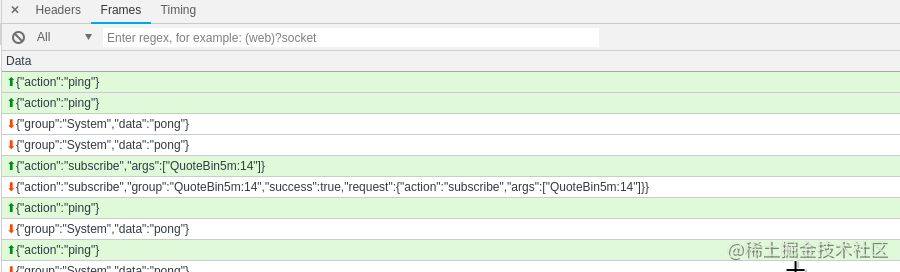 Headers 标签页记录的是 Request 和 Response 信息,而 Frames 标签页中记录的则是双方互传的数据,也是我们需要爬取的数据内容: