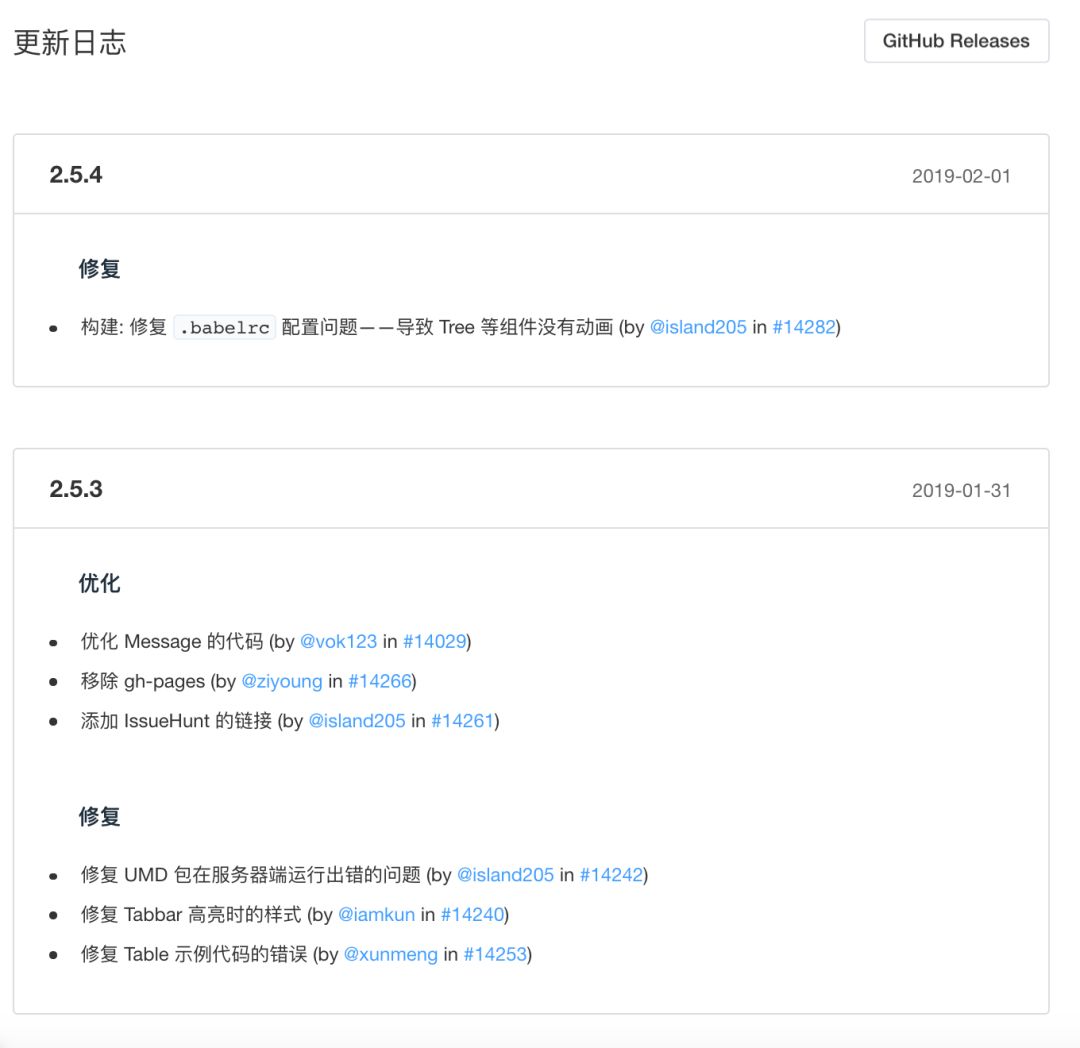 首先介绍下实现更新日志的思路,目标是做一个像下图(element ui的更新日志截图)这样的更新日志。