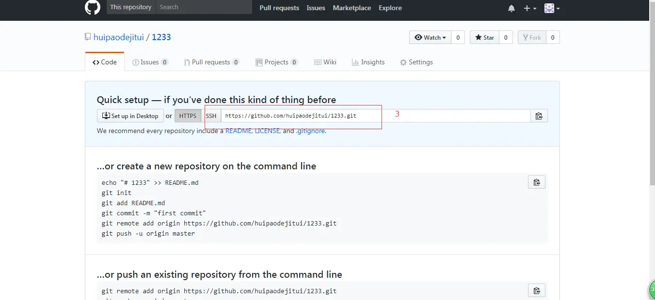 git remote add origin https://github.com/huipaodejitui/1233.git //本地与远程关联起来,地址为上面复制的远程地址