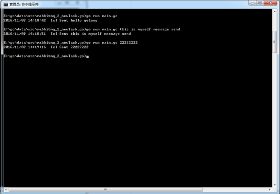 第3个窗口我们用来发送消息到队列,一旦消费者运行起来后便可以发送消息: