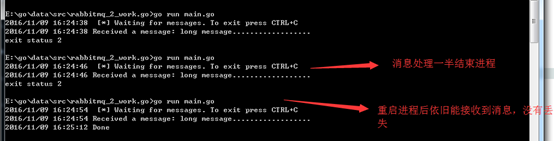 使用如上代码后,即时消息处理时按了Ctrl+C结束了进程,什么也不会丢失。工作进程挂掉后所有未应答的消息将会被重新分发。