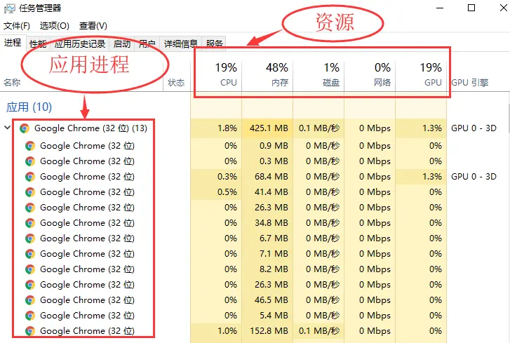 进程(process):当你的程序一旦被载入到内存中执行,那么你的这段程序就是一个进程。一个或多个进程组成系统当中运行的应用程序,如浏览器应用。另系统也会为应用的每一个进程分配独立的CPU、内存等资源。