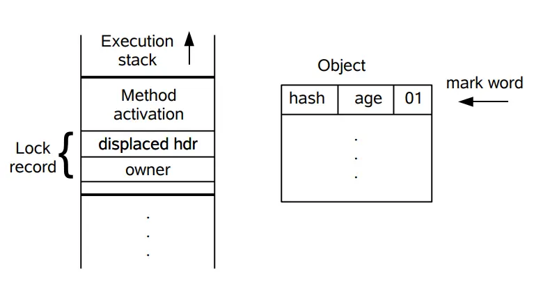 下图左侧是一个线程的虚拟机栈,其中有一部分称为 Lock Record 的区域,这是在轻量级锁运行过程创建的,用于存放锁对象的 Mark Word。而右侧就是一个锁对象,包含了 Mark Word 和其它信息。