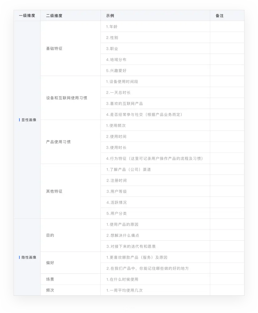 隐性画像:用户群体深层次的特征描述,如使用产品的目的、解决什么问题、偏好、诉求、场景、愿景、使用频率等。主要以问卷、访谈、意见反馈等方式直接获得数据。