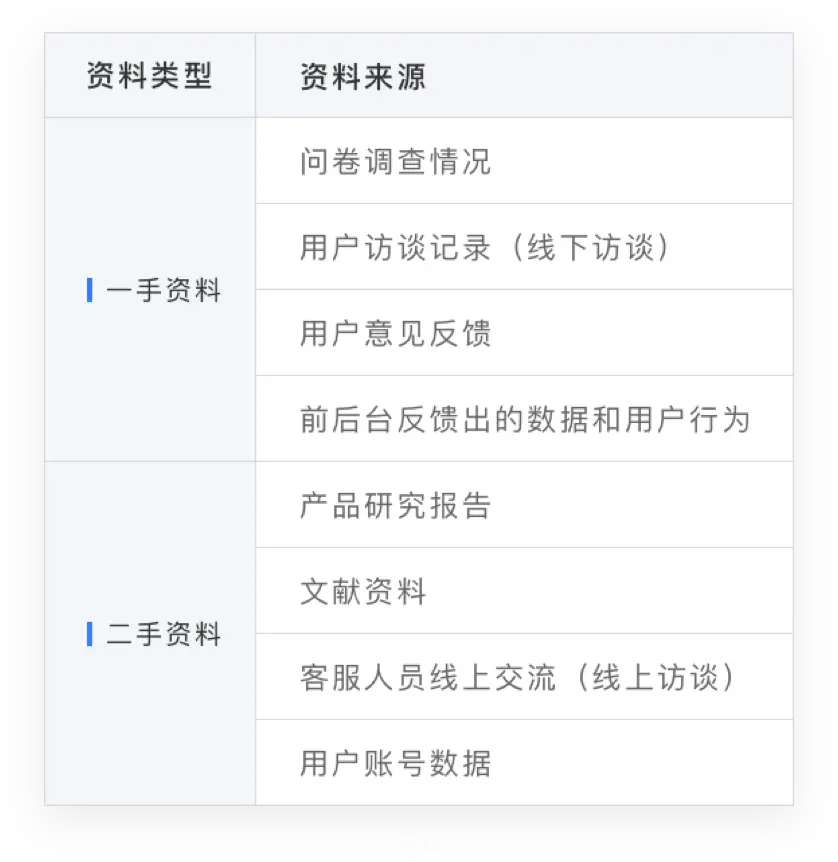 这些数据有三个来源:相关文献资料和研究报告、产品数据后台、问卷调研和用户访谈,可以按照以下维度区分:
