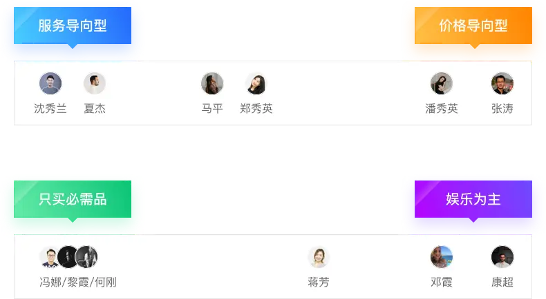 用户角色模型是针对特定产品或特定功能的,所以人物角色的分类一般是根据用户的目标(用户需求)、行为和观点(行为倾向)进行。