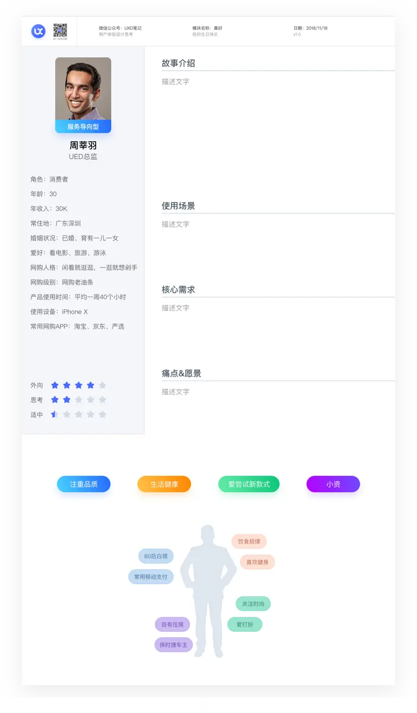 找出行为模式后,画像呈现即从显性画像、隐性画像、场景和需求等方面,给用户打标签,并且增加一点描述性语言(描述人物行为和痛点,而不是描述解决方案),图例: