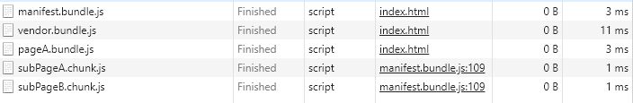 浏览器中打开index.html文件,会发现subPageA.chunk.js和subPageB.chunk.js没有引入也被导入了进来。其实这两个文件是webpack runtime打包文件根据代码分割的文件自动异步加载的。