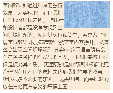 导致了,这个在早期风云一时的布局方法,已经有些跟不上时代的脚步了。不过在一种场景下,float布局却仍然是绝对的“主宰”。那便是围绕效果,这个应该也是当初推出float这一属性的本命任务了。