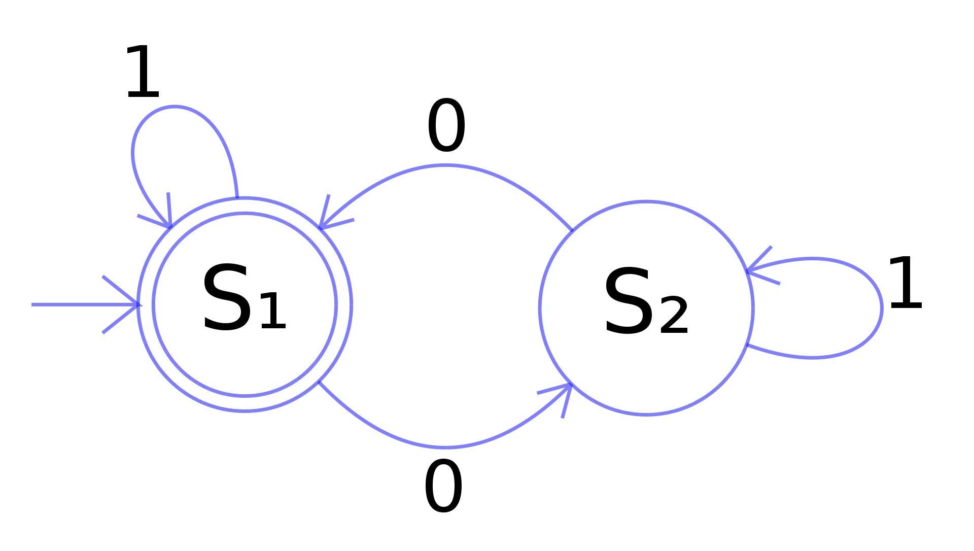 这是一张典型的状态机示意图,圆圈表示状态机中的状态,双圆圈也是状态,但它是特殊的,是最终状态,也就是接受状态。若根据输入,状态机最后的状态停留在最终状态,就意味着这个输入是可被接受的、合法的。箭头表示状态的转移,比如状态机处于 S2 状态时,往状态机输入 0,那么根据箭头,状态转移至 S1,输入 0 则“转移”到 S2, 也就是原地踏步,保持不变。注意,当输入 0 或 1 之外的字符时,状态机没有任何能适配该字符的转移,那么此时即可认为输入不合法了。