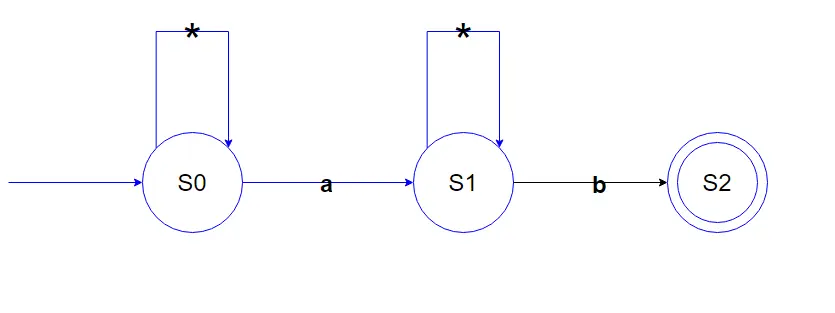 如上图所示,一开始状态机的状态是 S0,当字符 a 输入后,状态机的状态从 S0 转移到 S1,接着再往状态机中输入字符 a,但在 S1 状态上,没有任何可以转移的路径,因而该输入不合法,返回 false。