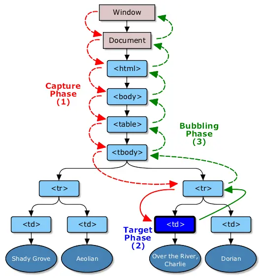 事件一开始从根节点流向目标对象(事件捕获),然后在目标对象上触发(目标阶段),之后回溯到文档的根节点(事件冒泡)。