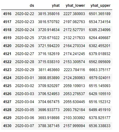 forecast[['ds', 'yhat', 'yhat_lower', 'yhat_upper']].tail(15)