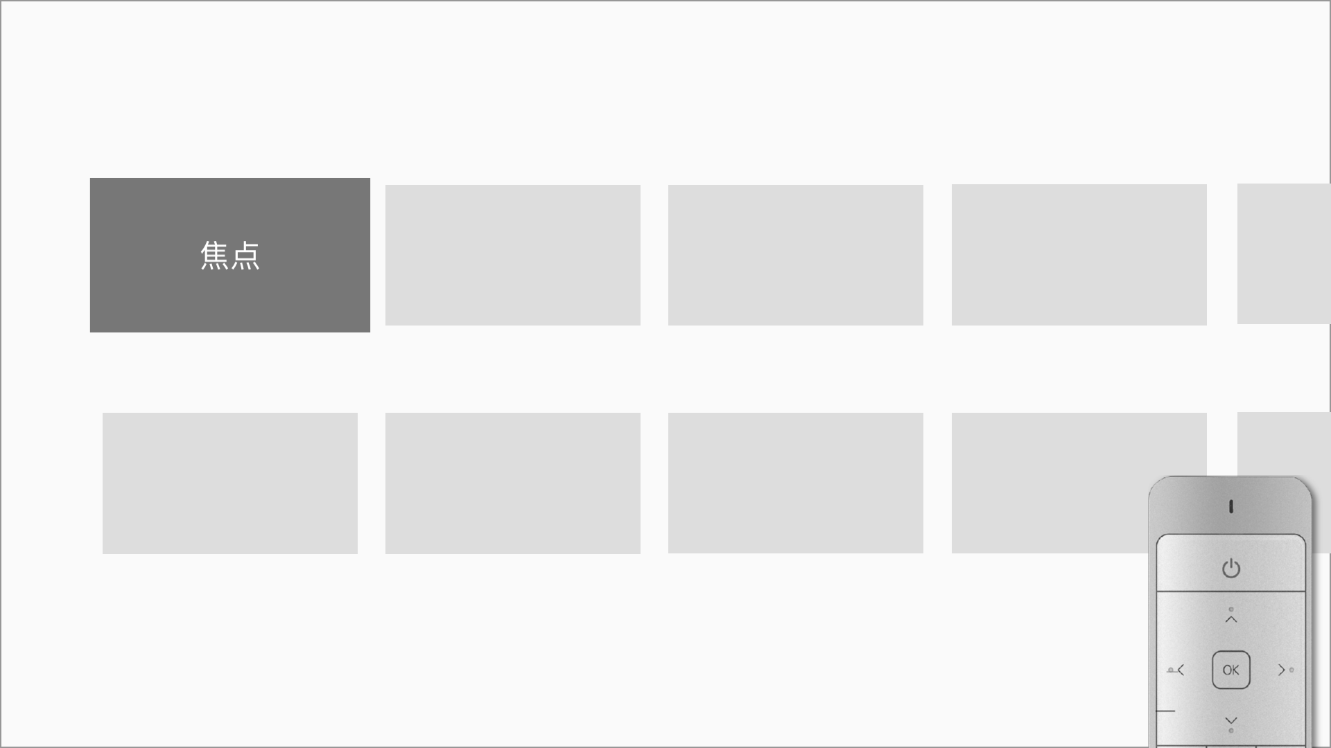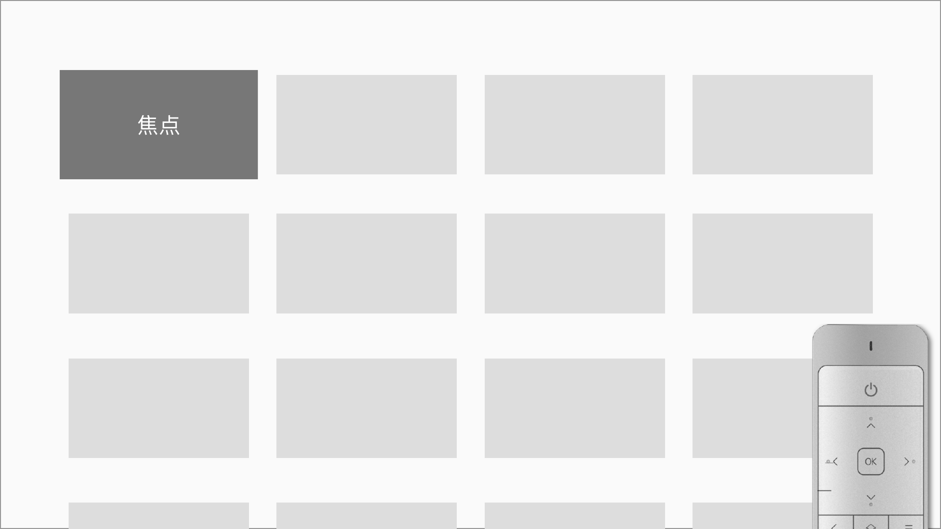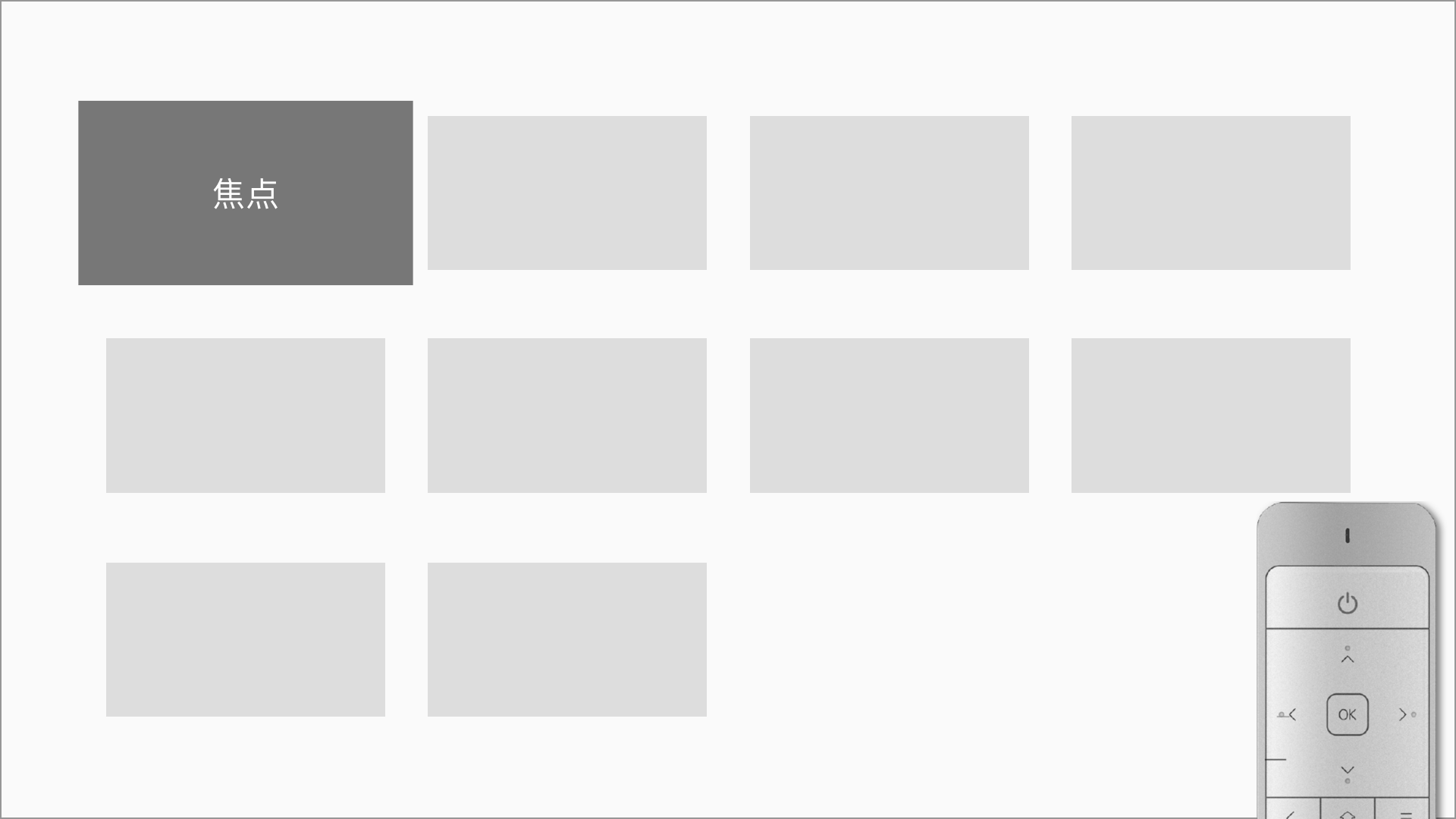 由于焦点的移动依赖遥控器「方向键」的来操作,所以焦点移动需遵循“十”字运动规则,且焦点的运动方向需和用户预期方向一致,如按【左】则焦点向左移动,按【右】则焦点向右移动,按【上】则焦点向上移动,按【下】则焦点向下移动。