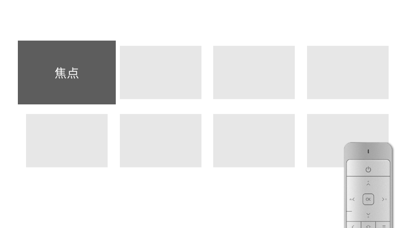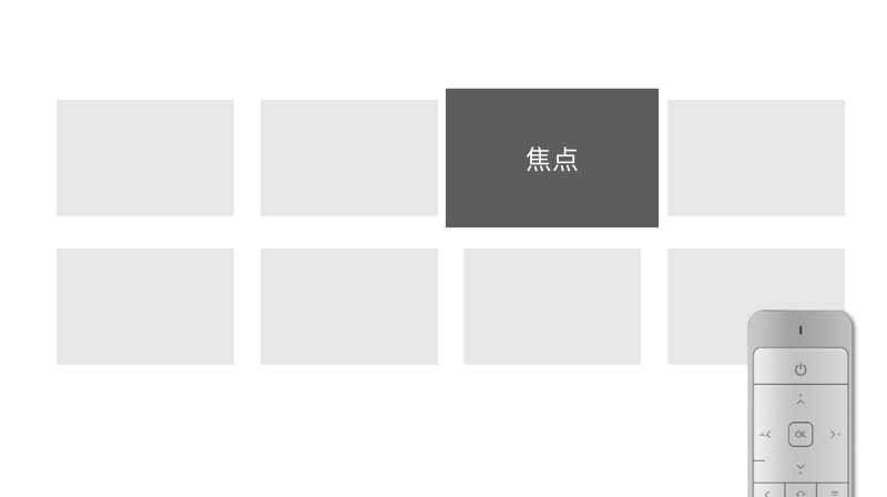 焦点就是在当前界面上,你的遥控器操作的起点(但并不是页面中的第一个卡片,因为有些默认焦点不是在页面中的第一个位置),当前选中的位置,类似PC端的hover状态(鼠标悬停)。如果此时你按方向键(上/下/左/右),则焦点在当前位置向其他位置移动。