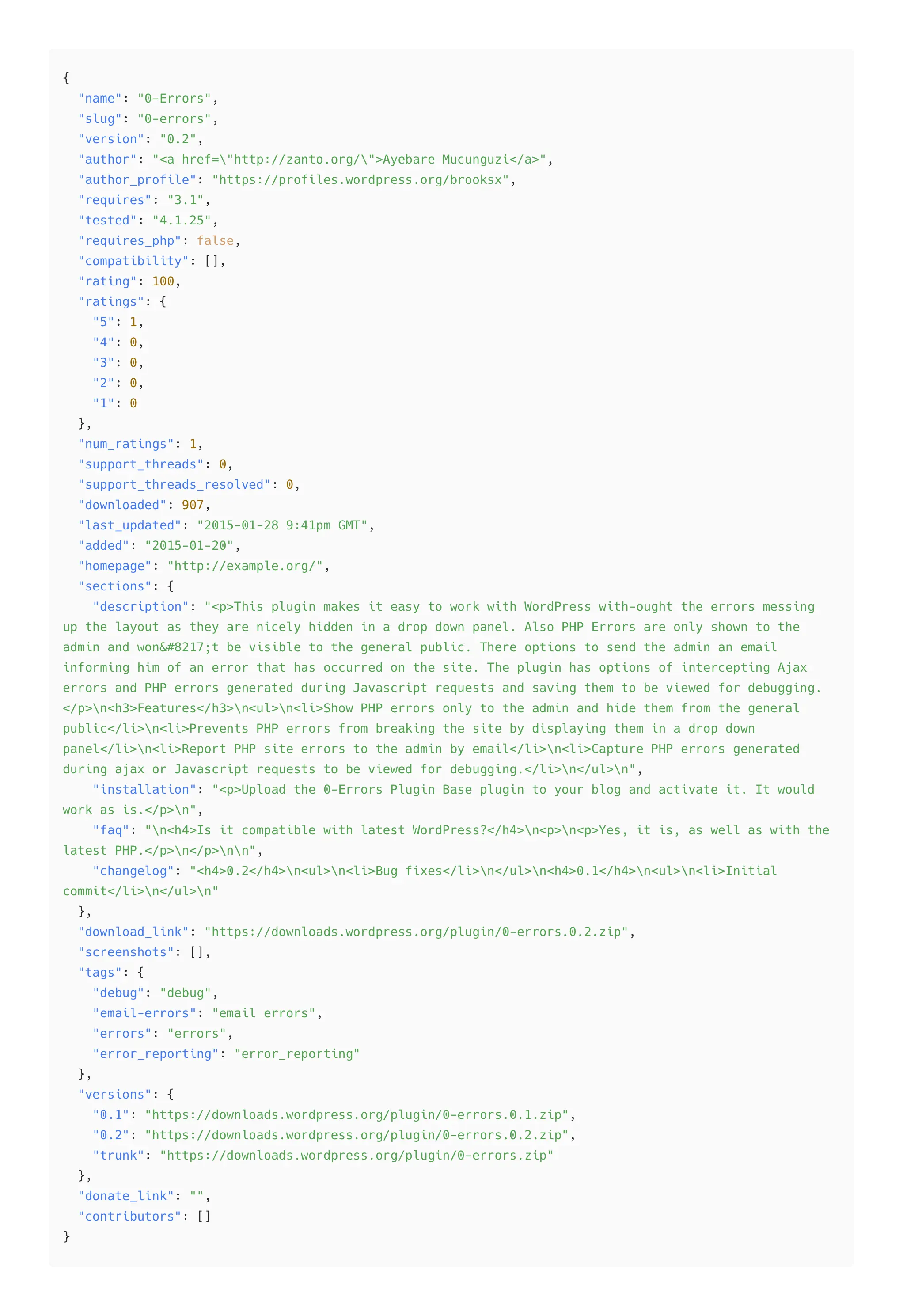 gsed -i '/"Plugin not found."/d' output.jsonl然后,还需要对数据结构有一个直观性的了解。有必要把json数据结构展示一下,一个正常插件的完整有效信息包容如下字段和值,基本上都可以望文生义,没有什么特别复杂奇怪的,后面的分析都是基于这些字段进行的: