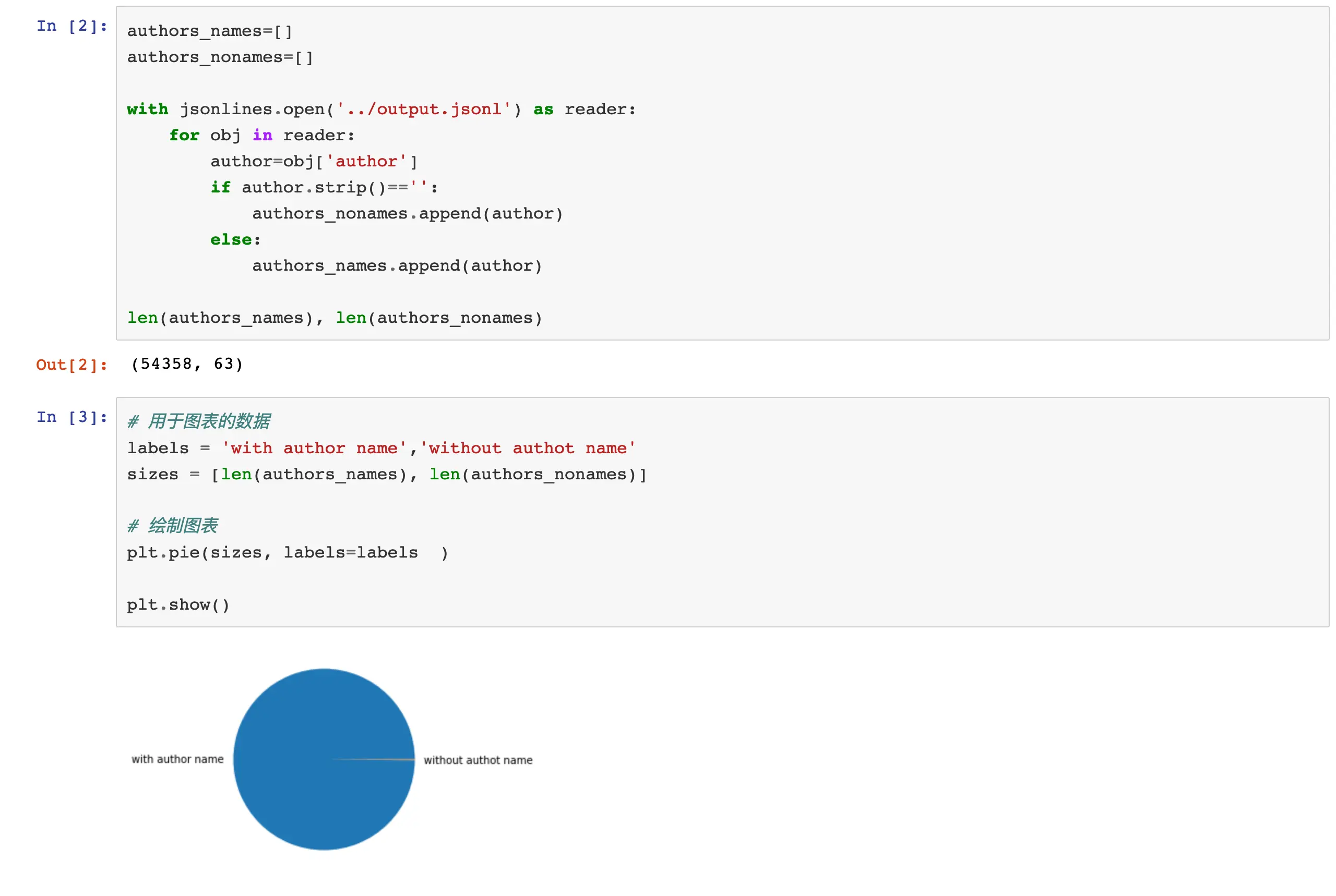 首先我们看下作者的数量情况,一般来说每个插件都会有作者名字的,但竟然也会有写插件连作者名字都没有。没名字的插件谁知道是什么野路子来的,用户也不敢安装。那我们看看有多少是没有名字的,小试牛刀。判断有没有名字的逻辑很简单,对于没有作者名字的插件,有author这个key,但值为空,这样数据jsonlines文件循环一遍就可以得出了