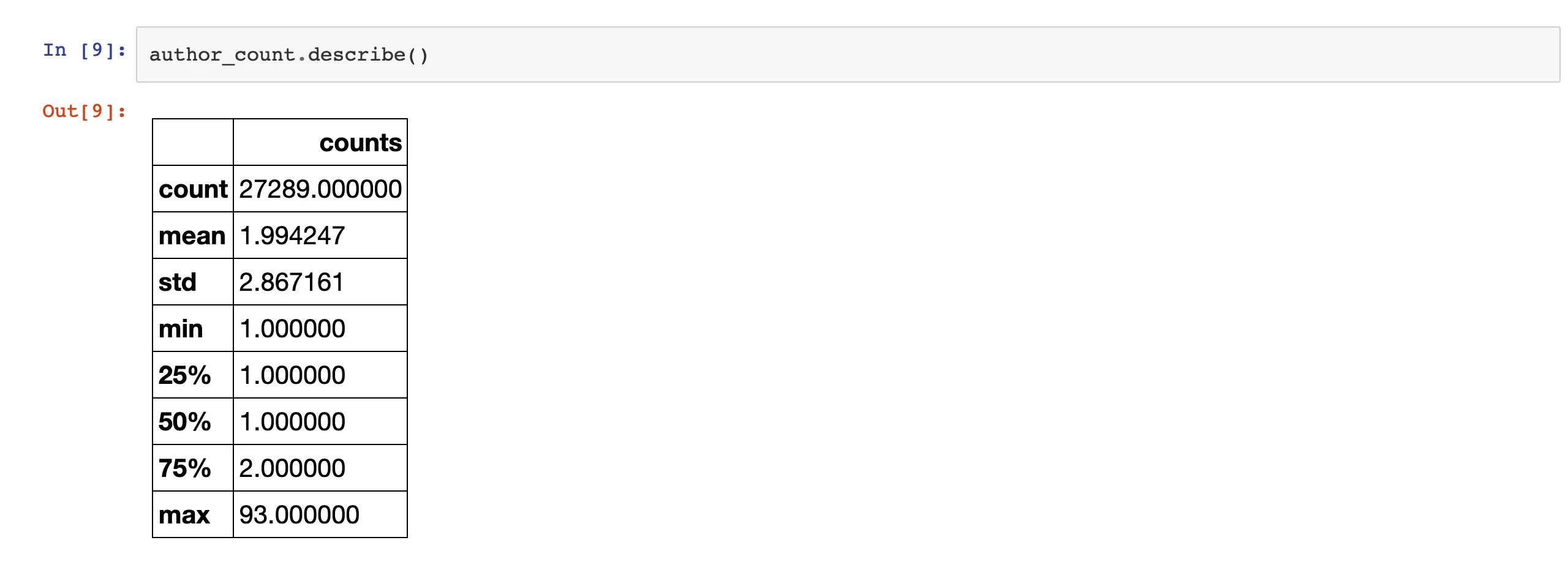 这种形式就相当于一个Excel文件,每行都是一个作者名字,并不能看出什么东西来。因为我们要这一步主要是要统计数量,也就是count,所以,需要把这个DataFrame转换成我们需要的形式,按作者计数。