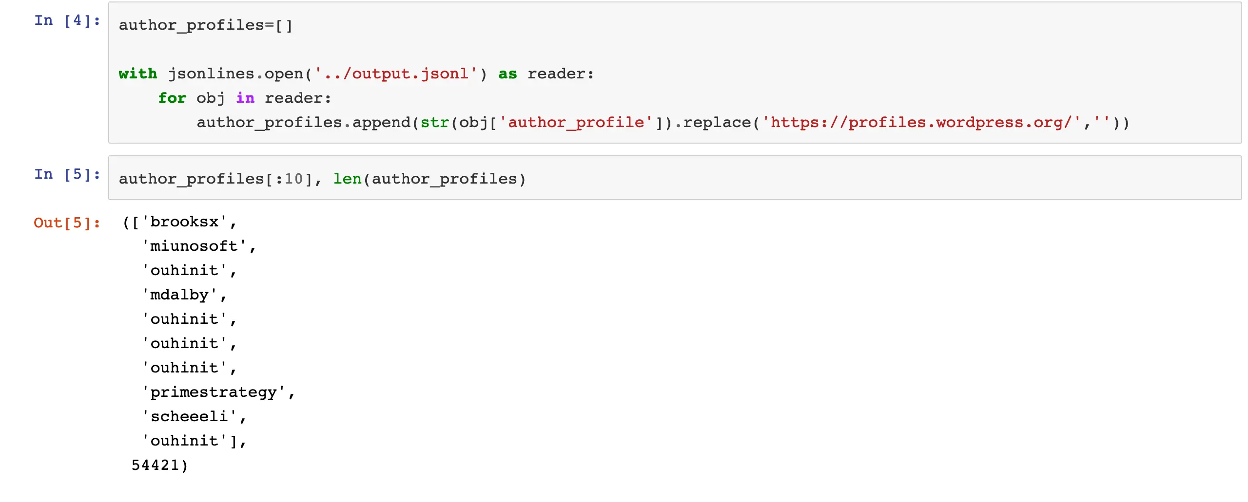 首先把所有的author_profiles都取出来,放入一个列表。保险起见author_profile把都转换str的格式,然后去掉其中重复的字段https://profiles.wordpress.org/,这个不去掉也成,主要是为了下面的图表展示时候名字不要那么拥挤