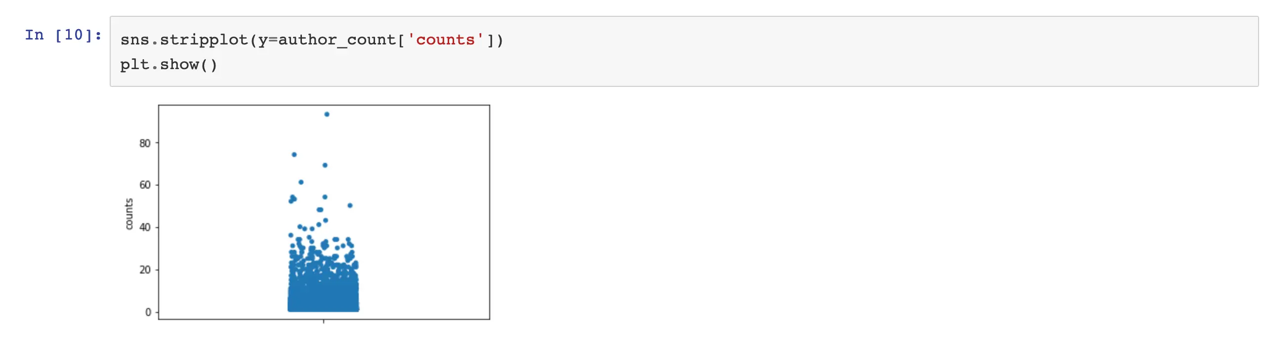 在我们的例子中,只有一个维度,所以使用分类散点图就可以直观的显示出同一作者的插件数量的分步。下图可以看出大部分大部分作者发布的插件数量是1-20个,那些开发了几十个插件的大牛真可以说是WordPress的死忠粉了,质量且不论,光这个数量没有极大的热情和勤奋度那是不可能完成的,当然,某些数量比较多的帐号也有可能是公司化运行的WordPress开发公司使用同一个帐号发布的。