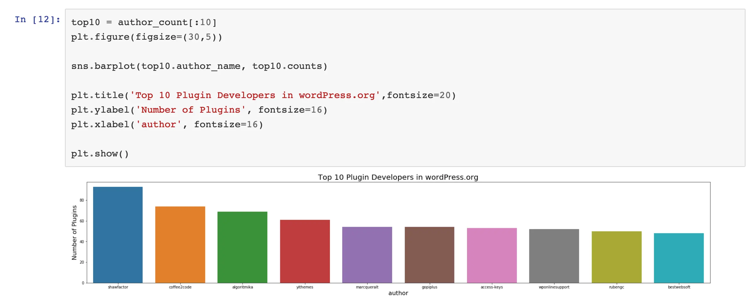 用author这个key来分析作者的插件数量的话,会有个问题,这个key里大部分是html代码形式,还有一部分是直接显示的文本,或者干脆就是空的,就像上面一步看到过的样子,有不少文字处理工作要做。那么我们可以看看另外一个key author_profile, 这个就是开发者在WordPress.og上注册的用户名了,是必须的,也是唯一的,类似这种https://profiles.wordpress.org/brooksx, 所以我们就用这个做分析吧