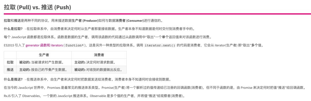 在这里要先引出一个新的概念:拉取(pull)和推送(push),rxjs官方这两种协议有更详细的解释,我这里就直接引用一下: