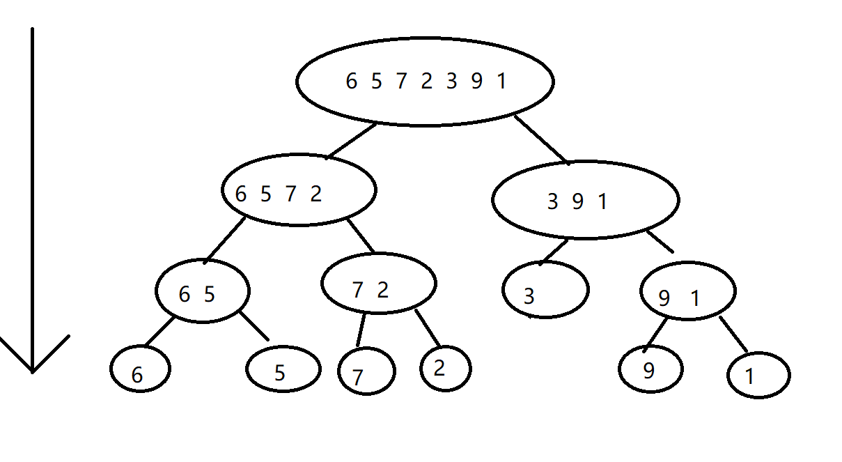 算法的精髓在于不短的划分和合并。当划分到不能再划分的时候,就开始合并。