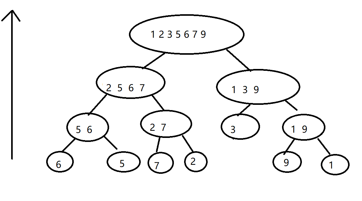 每一次排序将两个有序数组合并成为一有序个数组 时间复杂度为 n