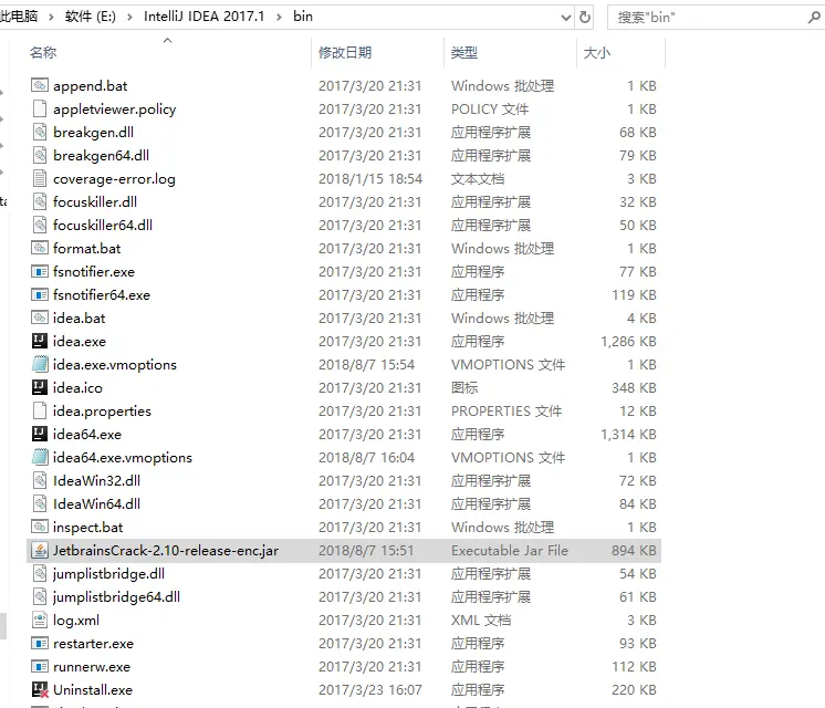 2.将你下载好的JetbrainsCrack-2.10-release-enc.jar拷贝到你的Idea安装目录的bin目录下。