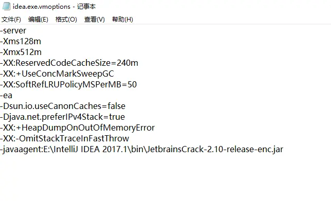 4。将这两个文件用记事本或者写字板打开,在两个文件最后一行添加:-javaagent:E:\IntelliJ IDEA 2017.1\bin\JetbrainsCrack-2.10-release-enc.jar。