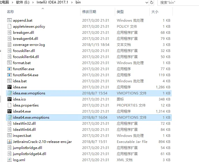 3.接下来在bin目录下找到两个vmoptions文件,idea.exe.vmoptions和idea64.exe.vmoptions如下图所示。