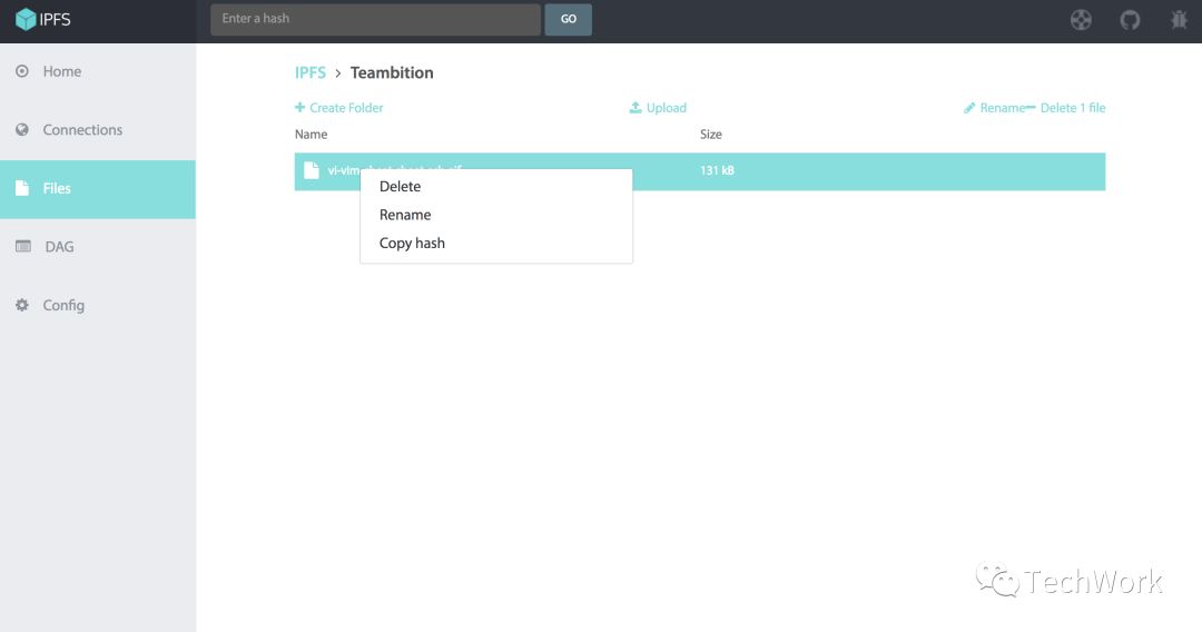 点击 Files > Upload > you file 上传至本地节点,成功后右键查看并复制生成的唯一 hash