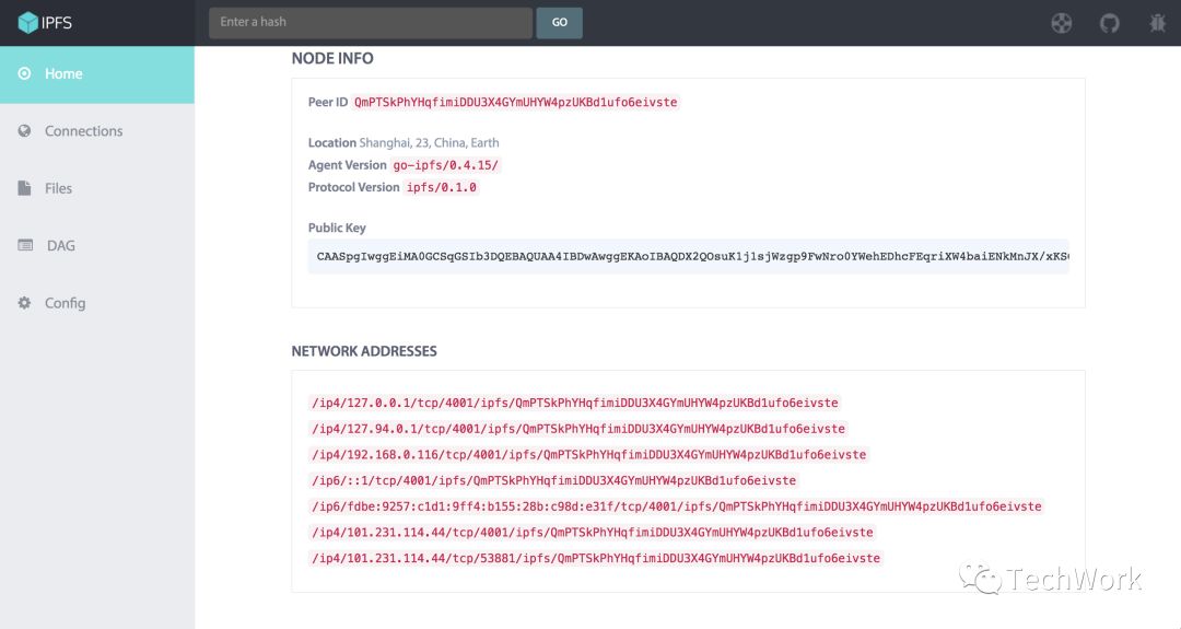 如何验证或者访问呢,打开浏览器输入 http://localhost:5001/webui,成功访问并查看UI界面是的没错,我们已经在地球上一座名叫上海的城市建立了我们自己的IPFS节点(: 果然是星际文件系统~)