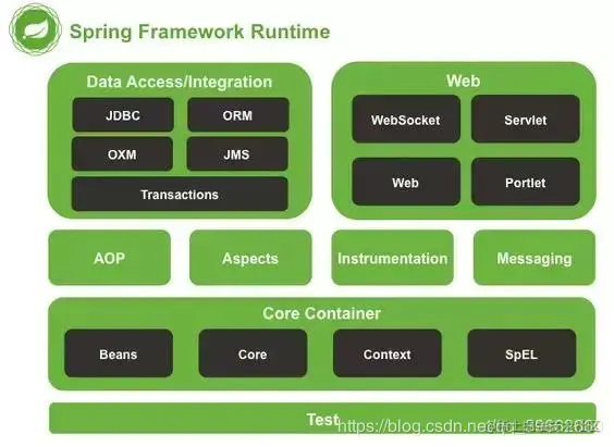 Spring框架至今已集成了20多个模块。这些模块主要被分如下图所示的核心容器、数据访问/集成,、Web、AOP(面向切面编程)、工具、消息和测试模块。