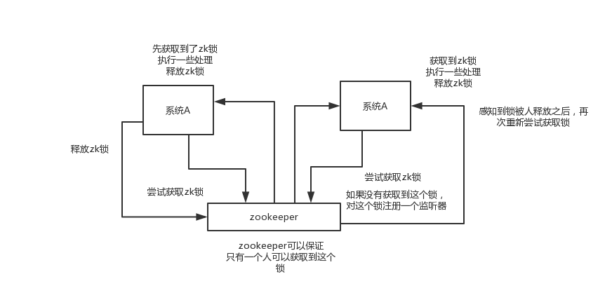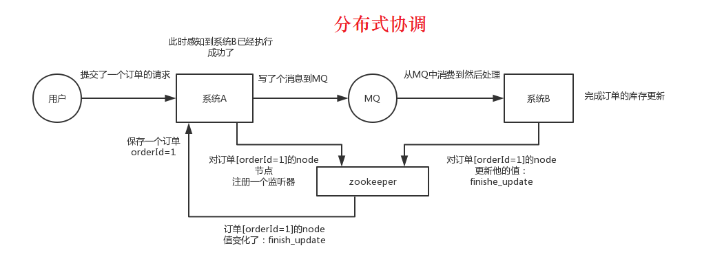 假设A系统发送个请求到mq,然后B消息消费之后进行处理,那A系统如何知道B系统的处理结果?用zk就可以实现分布式系统之间的协调工作。A系统发送请求之后可以在zk上对某个节点的值注册个监听器,一旦B系统处理完了就修改zk那个节点的值,A立马就可以收到通知,最终实现两个系统协调运行(比如B失败了,A监听不到后就会启动重发)。