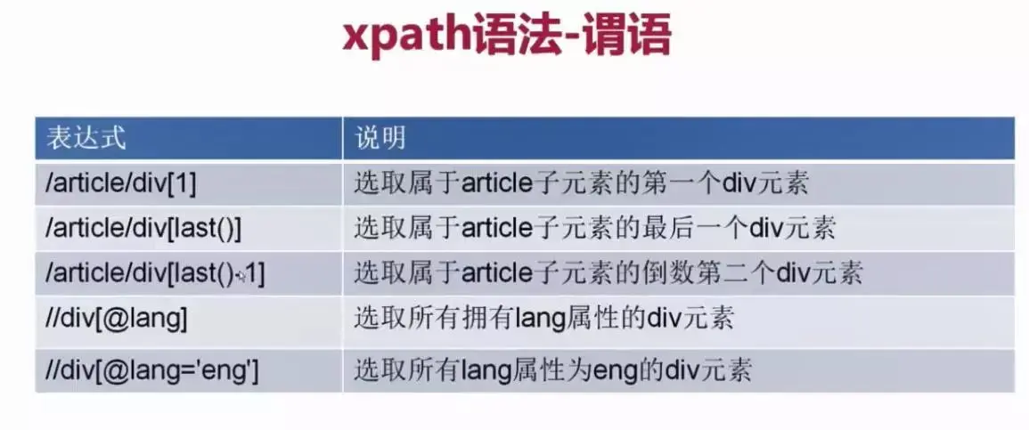 在这里列出了xpath的常用匹配规则,例如 / 代表选取直接子节点,// 代表选择所有子孙节点,. 代表选取当前节点,.. 代表选取当前节点的父节点,@ 则是加了属性的限定,选取匹配属性的特定节点。