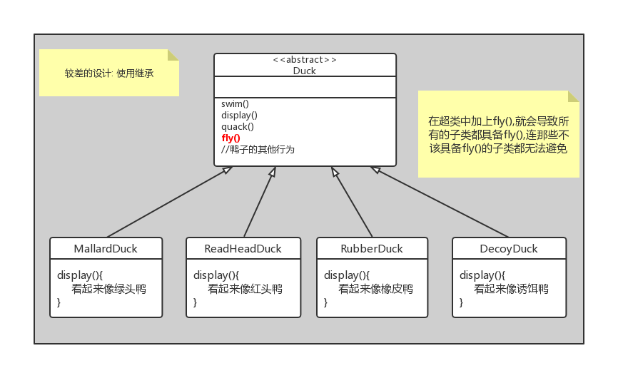 - 刚开始设计时,此系统设计了标准的OO技术,设计了一个鸭子超类,并让各种鸭子继承此超类