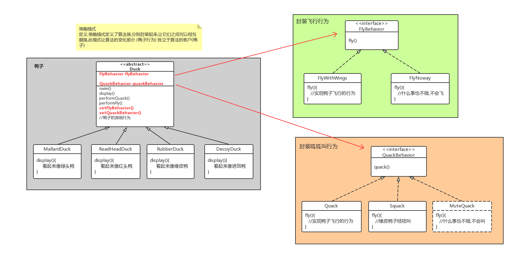 - 可变部分: 可能新增的各种行为 fly() , quack()