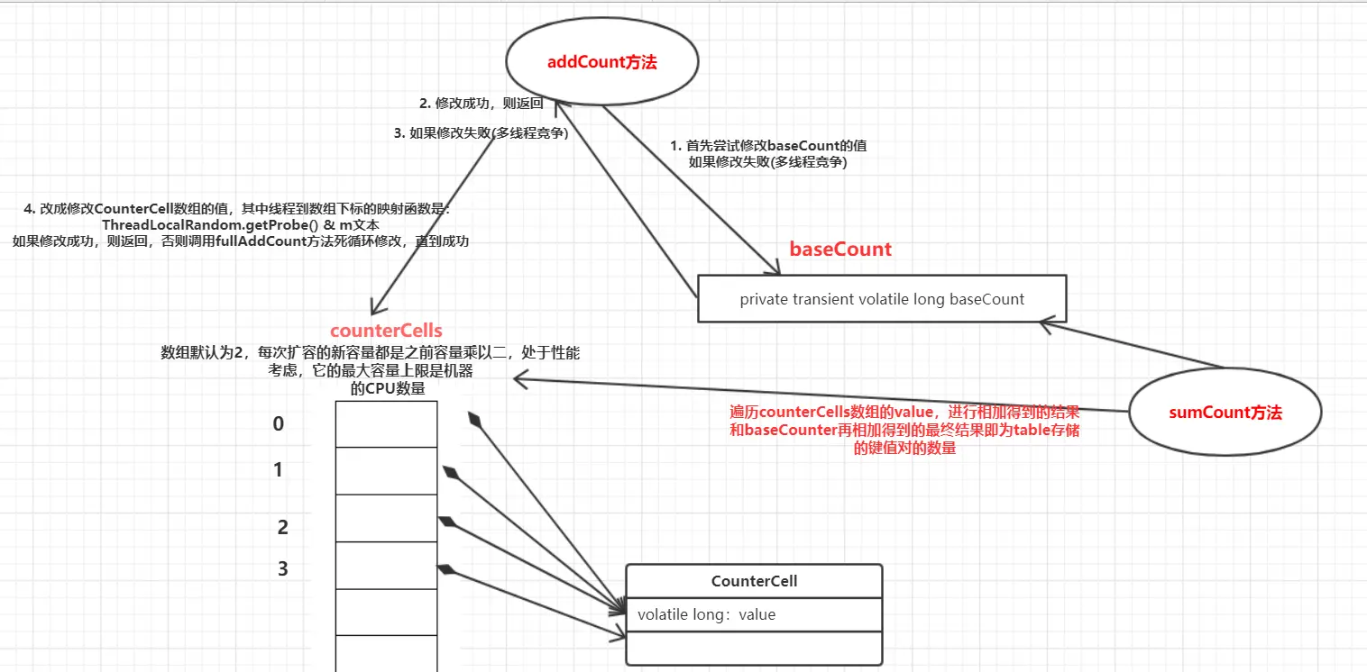 addCount()做的工作是更新table的size,也就是table存储的键值对数量,在使用put()和remove()方法的时候都会在执行成功之后调用addCount()来更新table的size。对于ConcurrentHashMap来说,它到底有储存有多少个键值对,谁也不知道,因为他是支持并发的,储存的数量无时无刻都在变化着,所以说ConcurrentHashMap也只是统计一个大概的值,为了统计出这个值也是大费周章才统计出来的。